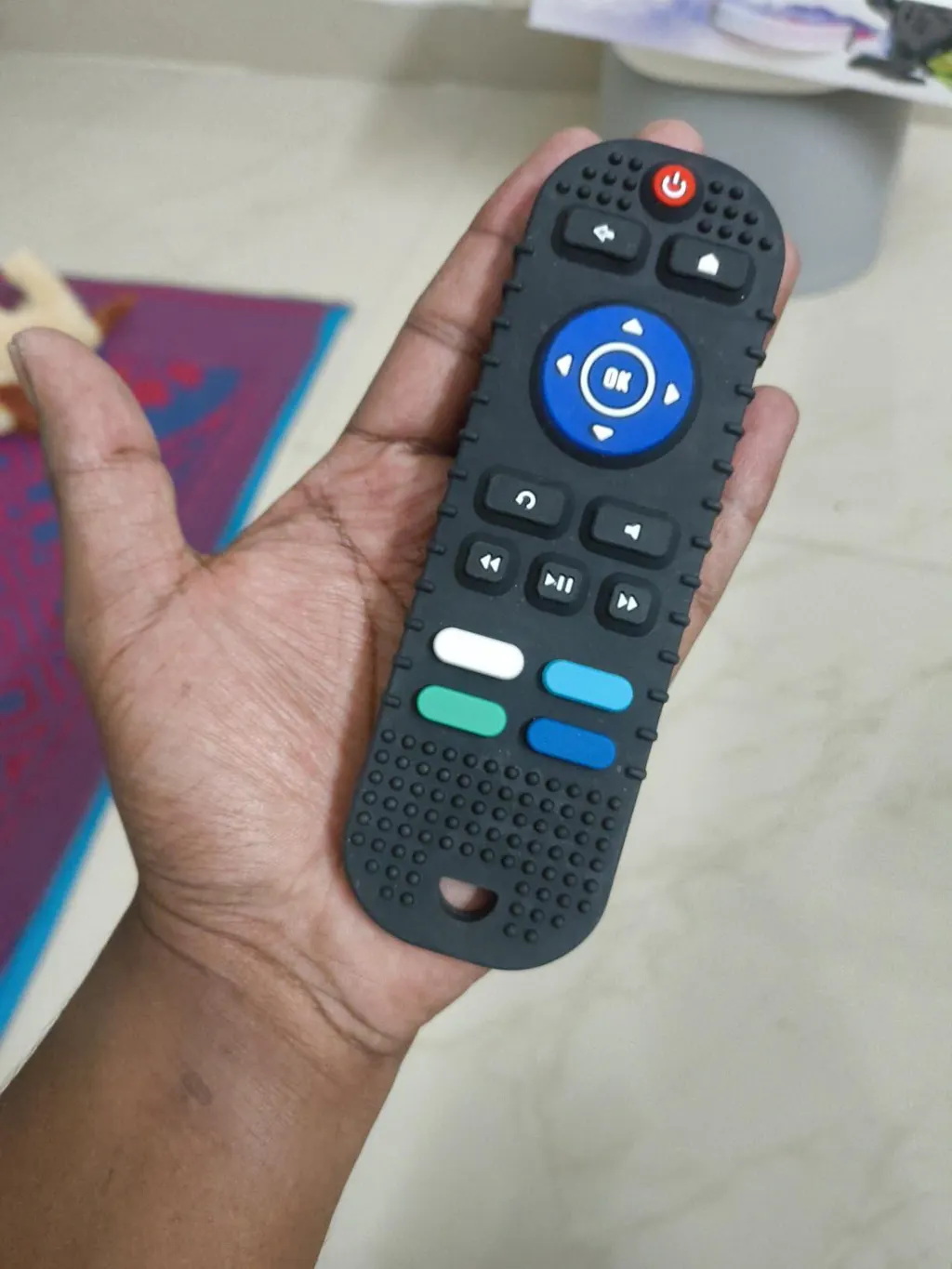 The remote shape is designed to fit naturally in little hands, giving babies something familiar to grip and chew keeping them happily occupied while soothing painful gums.